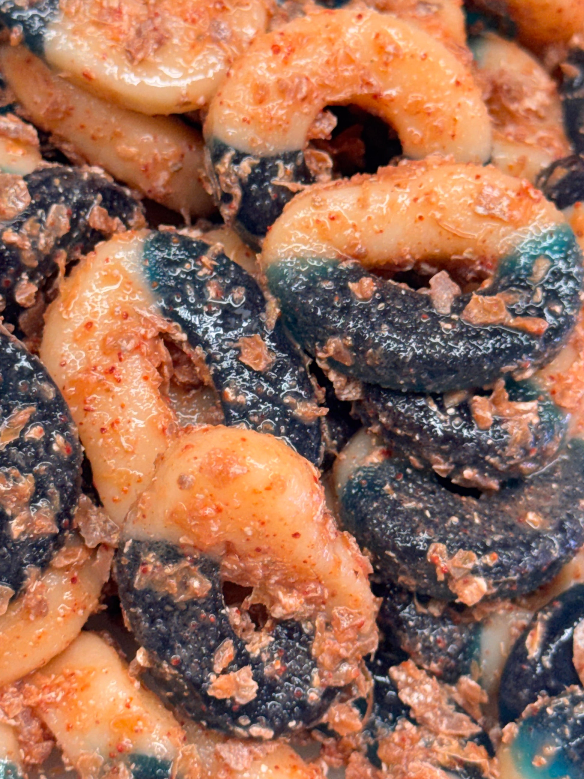 Discover the Unique taste of Li Hing Mui Lemon Peel Blue Raspberry Rings. Mixed with a tart Lemon Peel and the salty/sweet flavor of Li Hing Mui. These rings offer a chewy texture and a bold flavor. Perfect for those who appreciate a balance of tangy and sweet in every bite.